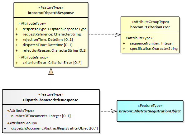 Onder normale omstandigheden bestaat het antwoord op een DispatchCharacteristicsRequest (verzoek tot uitgifte van kengegevens) uit een DispatchCharacteriscticsResponse (bericht van verzending van kengegevens). Het antwoord dispatchCharacteristicsResponse is gedefinieerd in het XSD-bestand dsbhr-messages.xsd. Het is een specialisatie van DispatchResponse zoals gedefinieerd in brocommon.xsd. Het voegt daaraan toe het attribuut numberOfDocuments (aantal documenten) en een lijst met dispatchDocuments (uitgiftedocumenten).