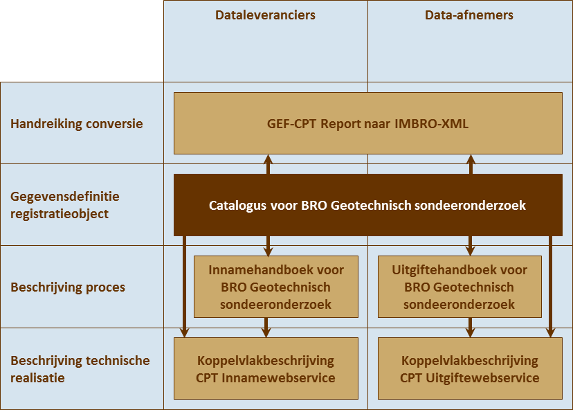 Voor geotechnisch sondeeronderzoek is er nog een aanvullend document, de handreiking voor conversie. In die handreiking wordt inzichtelijk gemaakt hoe de informatie uit het GEF-CPT formaat naar IMBRO-XML moet worden omgezet. Het GEF-formaat is de nu in het werkveld gebruikte standaard voor uitwisseling, en IMBRO-XML is het formaat dat de BRO vraagt. Deze documenten hangen samen zoals hieronder afgebeeld.