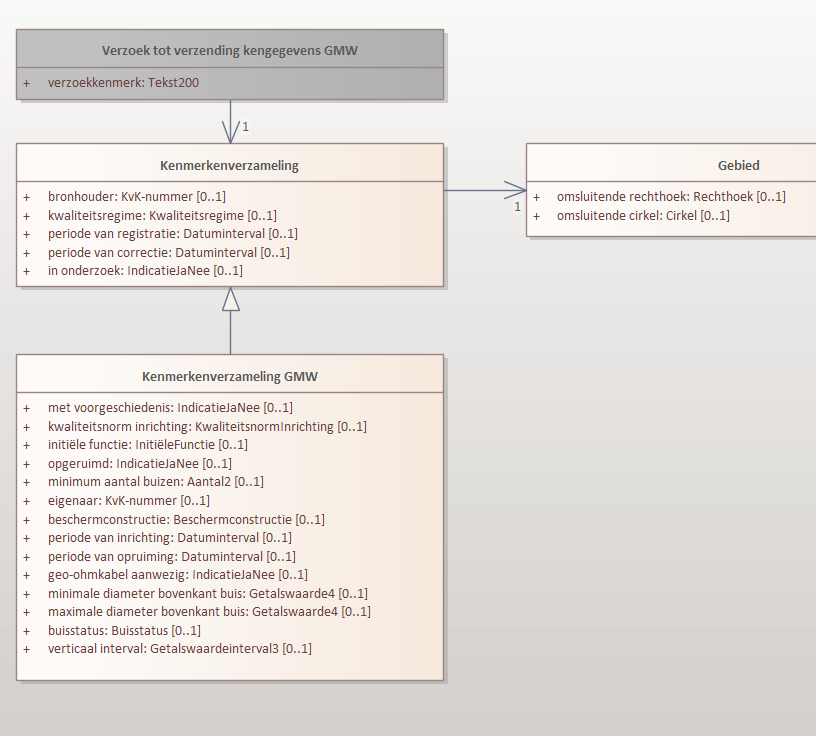 Het belangrijkste onderdeel van het verzoek tot verzending van kengegevens is de kenmerkenverzameling, dat is het geheel van kenmerken waaraan de grondwatermonitoringput die de afnemer wil krijgen moet voldoen. Door het meegeven van kenmerken kan de data-afnemer de zoekvraag preciseren naar plaats, tijd en aard van de constructie.