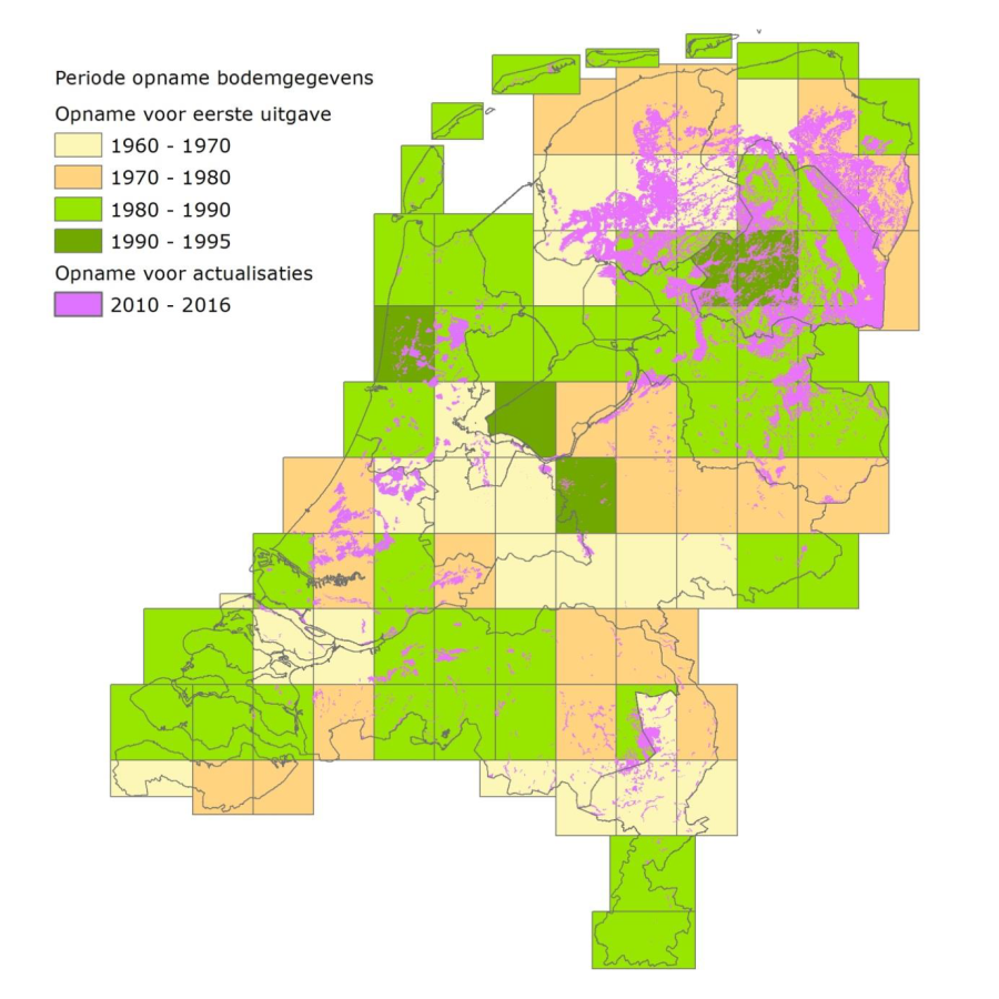 Rond 1960 is Stiboka in Zeeland gestart met de landelijke kartering van de bodem op schaal 1 : 50 000. De kaart is uitgegeven per kaartblad van de topografische kaart, schaal 1 : 50 000, met daarbij een toelichting in boekvorm. Door de aanpak per kaartblad verschilt de periode van opname van blad tot blad (fig. 2). Het veldwerk voor het laatste kaartblad is in 1995 afgerond. De bodemkaart is als GIS-bestand beschikbaar (versie 1). Hiervoor zijn de analoge kaarten gedigitaliseerd. Na de eerste opname zijn vanaf 2010 fragmenten van de kaart geactualiseerd. De inventarisatiemethode bij de actualisatie wijkt af van de methode die bij de eerste opname is gehanteerd.