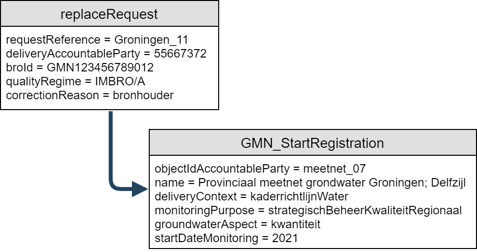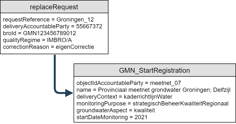 Het voorbeeldbericht 12replaceRequestStartRegistrationAspect.xml bevat een correctieverzoek, waarmee de waarde voor het groundwaterAspect (grondwateraspect) van een grondwatermonitoringnet wordt vervangen.