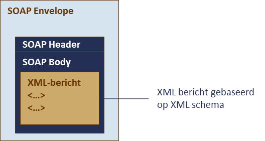 SOAP (Simple Object Access Protocol) is een protocol voor het versturen van berichten. Een SOAP bericht bestaat uit een Envelope met daarin de Header en de Body. De Body bevat het eigenlijke XML-bericht dat uitgewisseld wordt. Ieder XML-bericht dat als onderdeel van een SOAP-bericht met het BRO-systeem uitgewisseld wordt, is beschreven in een aantal BRO XML-schema's (XSD). Deze structuur van een SOAP-bericht is in de volgende afbeelding samengevat.