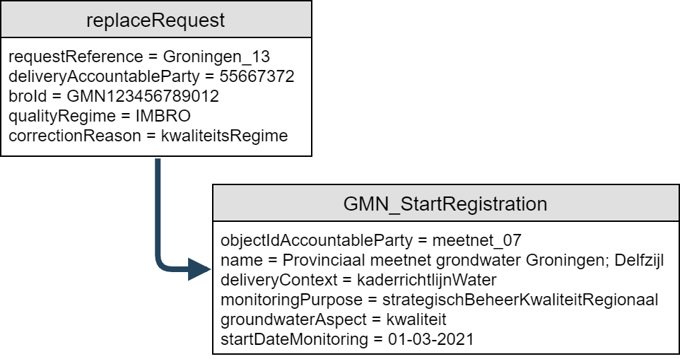 Het voorbeeldbericht 13replaceRequestStartRegistrationQualityRegime.xml bevat een correctieverzoek, waarmee de waarde voor het qualityRegime (kwaliteitsregime) van een grondwatermonitoringnet wordt vervangen.