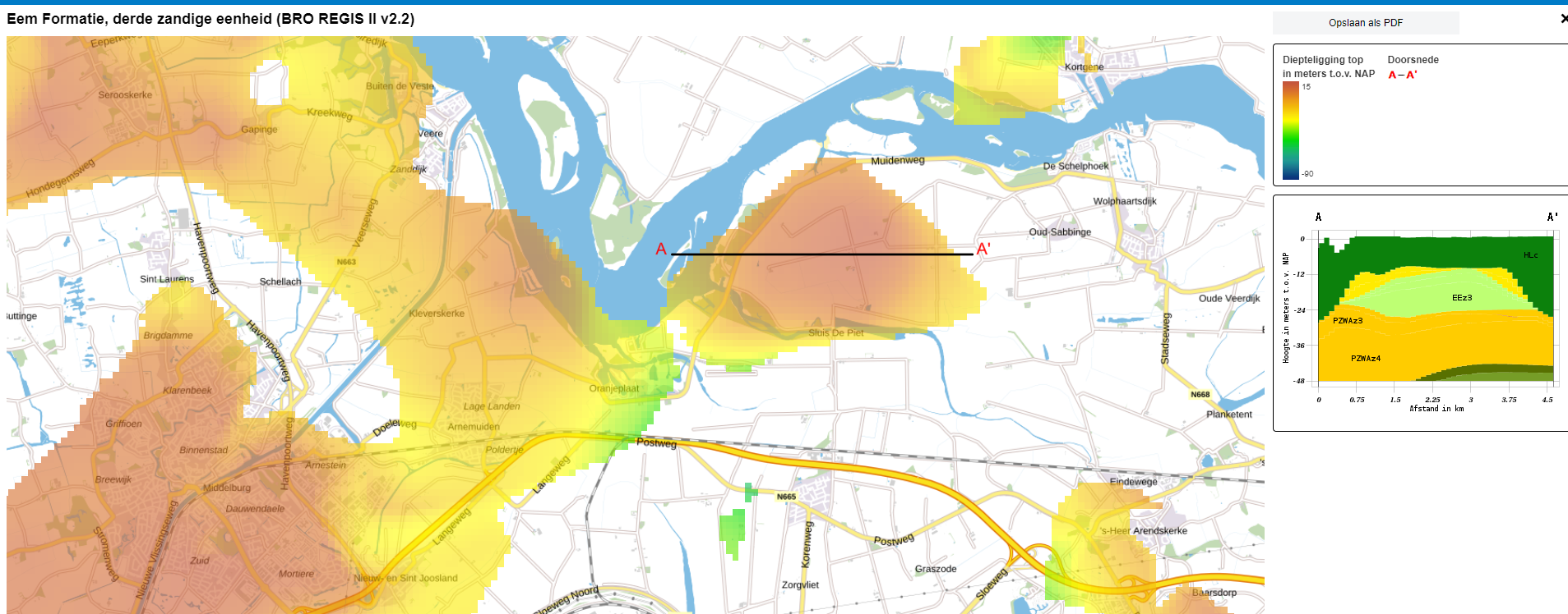 214 | BM23 02 00310 | Ik leerde vorige week een interessante feature van BRO-loket, nl, dat als je in Regis een bepaalde formatie aanklikt in een doorsnede, je een ruimtelijk plaatje van de top- of basisdiepte van de betreffende formatie kunt krijgen. Heel mooi, maar de kleuring is geschaald op de nationale hoogterange waarop de betreffende formatie voorkomt. Voor Zeeland, met zijn bescheiden reliëf, zou een dynamische schaling erg prettig zijn, omdat voor de meeste formaties de regionale top weinig boven NAP ligt en dus een groot deel van de kleurschaal onbenut blijft. Ook de diepte in zou beperking soms heel handig zijn. Ter illustratie heb ik de Top van de Eemafzetting bijgevoegd, waarbij de schaal tot -90 m gaat, maar voor het deelgebied waarin wij geïnteresseerd zijn -30 al heel ruim is. ![]() | |