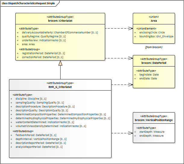 Het datatype BHR_G_CriteriaSet, (Kenmerkenverzameling) is een specialisatie van CritriaSet (Kenmerkenverzameling) uit brocommon.xsd, waaraan het een lijst met BHR-G specifieke attributen toevoegt. Alle attributen binnen BHR_G_CriteriaSet zijn optioneel. De meeste attributen hebben een scalair datatype, met uitzondering van de Attributegrouptypes DatePeriod (Datum interval) zoals gedefinieerd in brocommon.xsd en VerticalPositionRange (Diepte interval) zoals gedefinieerd in dsbhrg-messages.xsd.