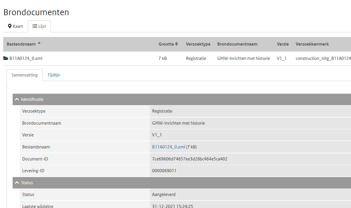 Het is ook mogelijk om de gegevens van een levering te bekijken via de lijstweergave. Daar zie je, na het openklikken van een brondocument, dezelfde informatie als op de kaart: