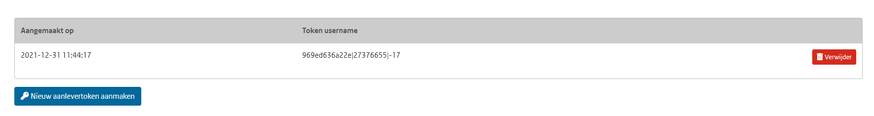 In dit voorbeeld zie je dat één token actief is. Je ziet alleen de Token username. Het wachtwoord is niet meer te achterhalen. Als je het wachtwoord kwijt bent, is het advies om het token te verwijderen en een nieuwe aan te maken.