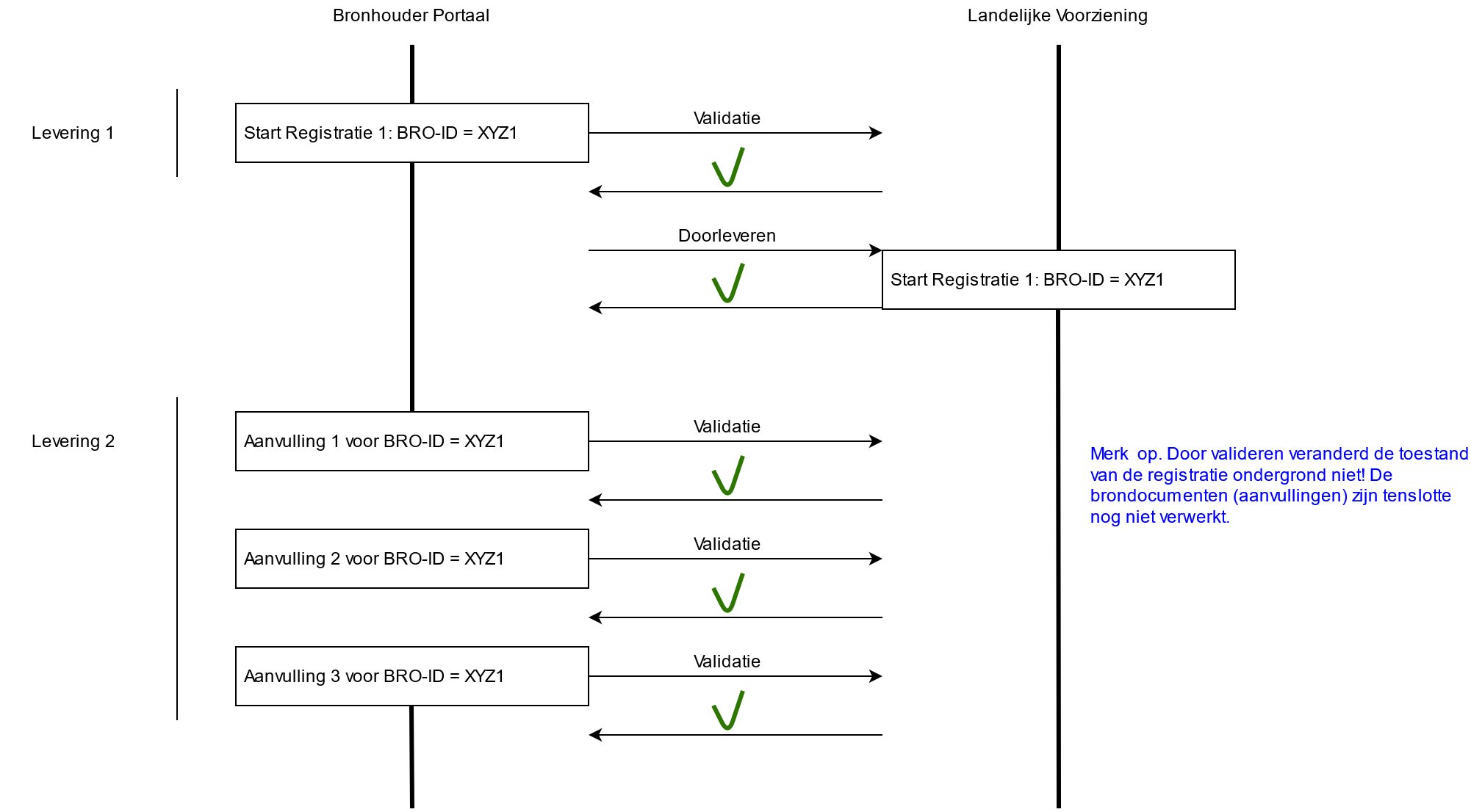- Stel een dataleverancier begint met een levering 1. Hierin zit alleen de start registratie. Het valideren en doorleveren (registreren) is succesvol. Er wordt een BRO-ID (hier voor het gemak XYZ1) teruggegeven. Voor een daadwerkelijke situatie is dit natuurlijk bijvoorbeeld: GMW000000139638, GMN000000005212 of GLD000000003404.