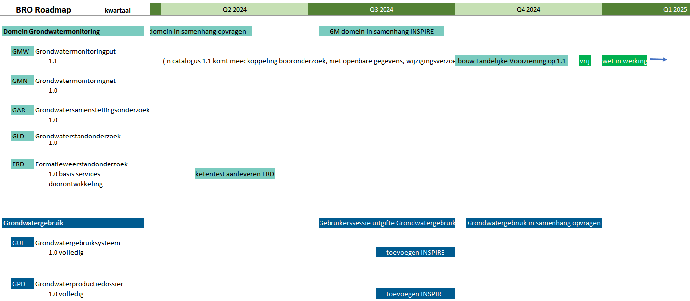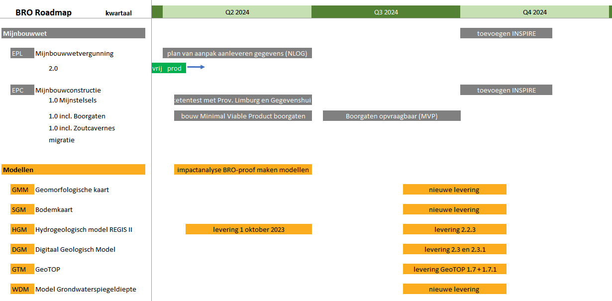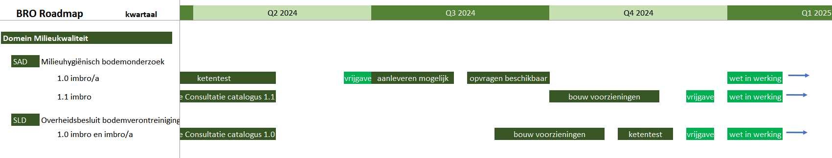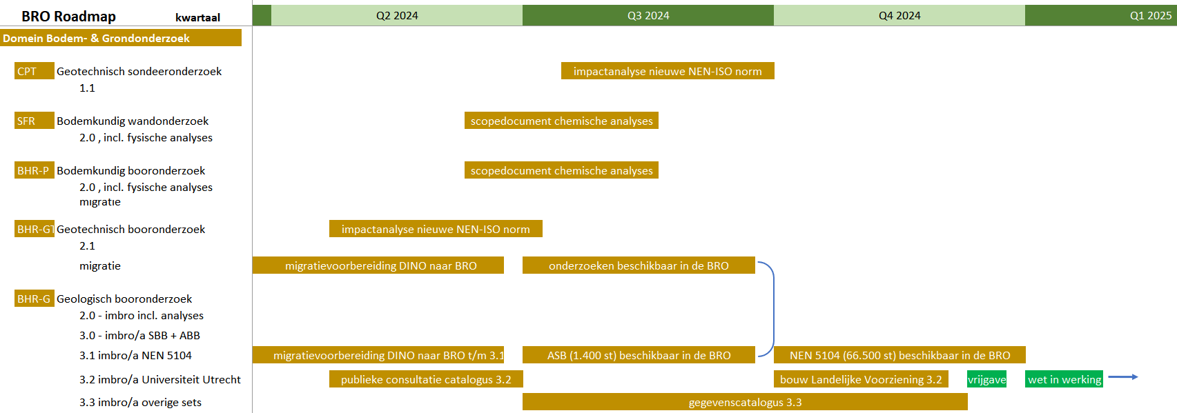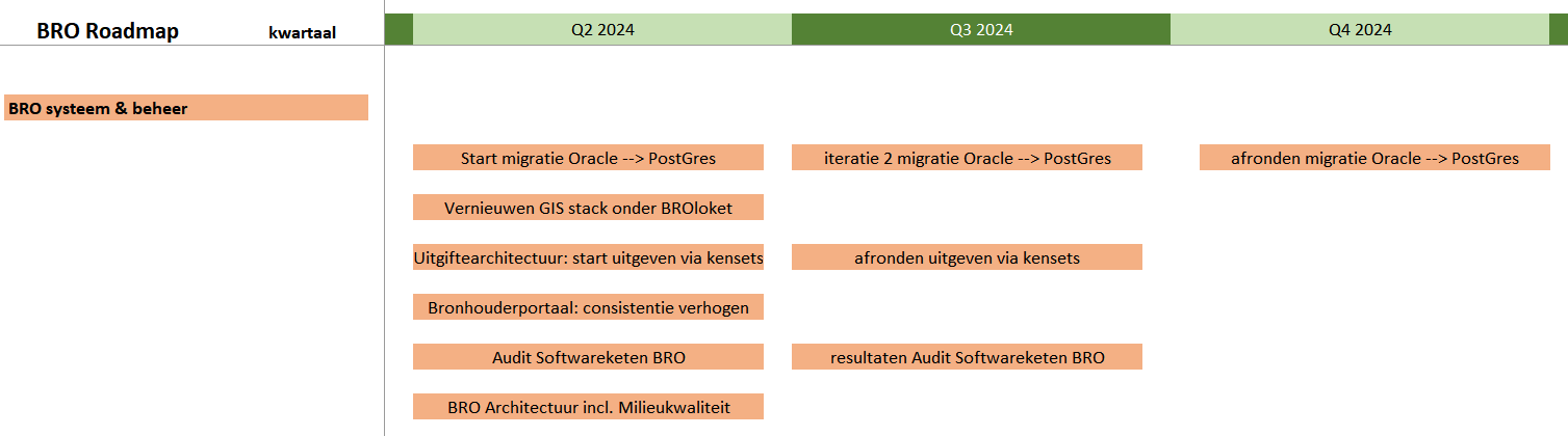 Hier onder wordt de meest recente roadmap van het BRO programma weergegeven. Deze omvat zowel de realisatie van BRO-fase 2 (Milieukwaliteit) als het beheer en de afronding van BRO-fase 1.