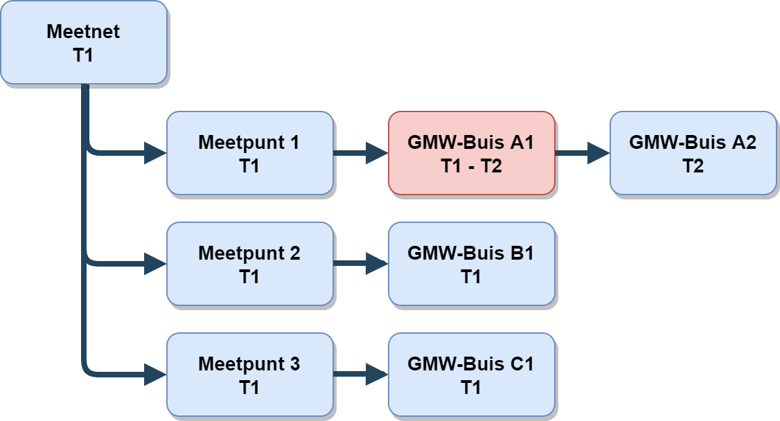Vanaf T2 vervangt de buisverwijzing A2 de buisverwijzing A1 binnen meetpunt 1. Buisverwijzing A1 was geldig vanaf T1 tot T2 en is nu een historische buisverwijzing. Buisverwijzing A2 is vanaf T2 de actuele buisverwijzing van dit meetpunt.