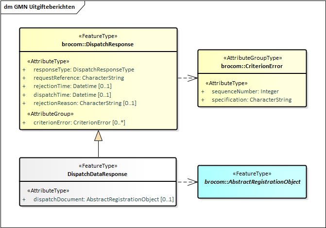 Het BRO-bericht DispatchDataResponse (Antwoord) bevat het functionele antwoord op een uitgifteverzoek. De DispatchDataResponse (Antwoord) van de GMN uitgiftewebservice is een specialisatie van DispatchResponse in de package brocommon, waaraan het een dispatchDocument (uitgiftedocument) toevoegt. De DispatchResponse in brocommon definieert een aantal gegevens en een optionele lijst met criterionErrors (kenmerkfouten).