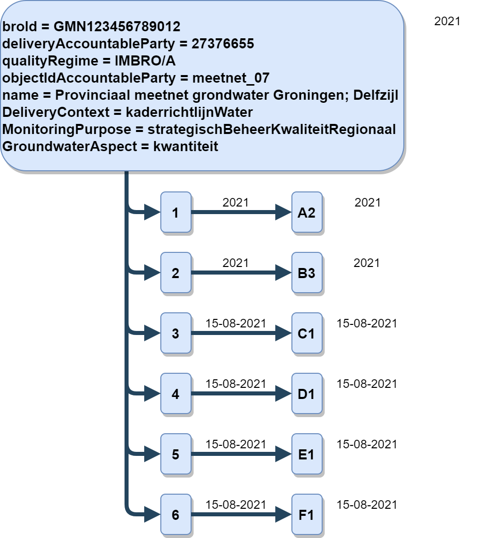 Een bronhouder heeft een grondwatermonitoringnet met 6 meetpunten. De bronhouder heeft het aanbieden van de gegevens uitbesteed aan een dataleverancier. De dataleverancier heeft de gegevens aangeboden in 2 registratieverzoeken: een verzoek om de registratie te starten ergens in 2021 en een verzoek om de registratie aan te vullen met vier meetpunten met ingang van 15 augustus 2021.