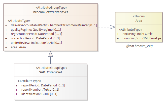 De criteria (kenmerken) worden gedefinieerd door het type SAD_CriteriaSet van de SAD uitgiftewebservice. De SAD_CriteriaSet (kenmerkenverzameling) is een specialisatie van CriteriaSet uit package brommon, waaraan het een aantal optionele attributen toevoegt .