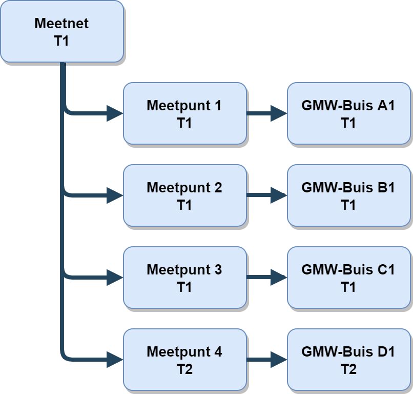Vanaf T2 vervangt de buisverwijzing A2 de buisverwijzing A1 binnen meetpunt 1. Buisverwijzing A1 was geldig vanaf T1 tot T2 en is nu een historische buisverwijzing. Buisverwijzing A2 is vanaf T2 de actuele buisverwijzing van dit meetpunt.