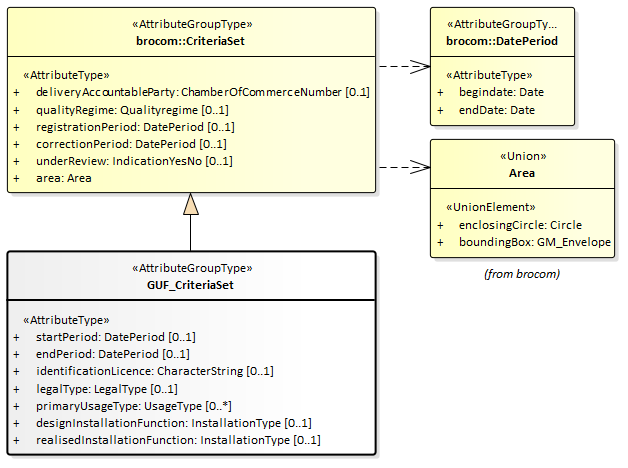 De criteria (kenmerken) worden gedefinieerd door het type GUF_CriteriaSet van de GUF uitgiftewebservice. De GUF_CriteriaSet (kenmerkenverzameling) is een specialisatie van CriteriaSet uit package brommon, waaraan het een aantal optionele attributen toevoegt .