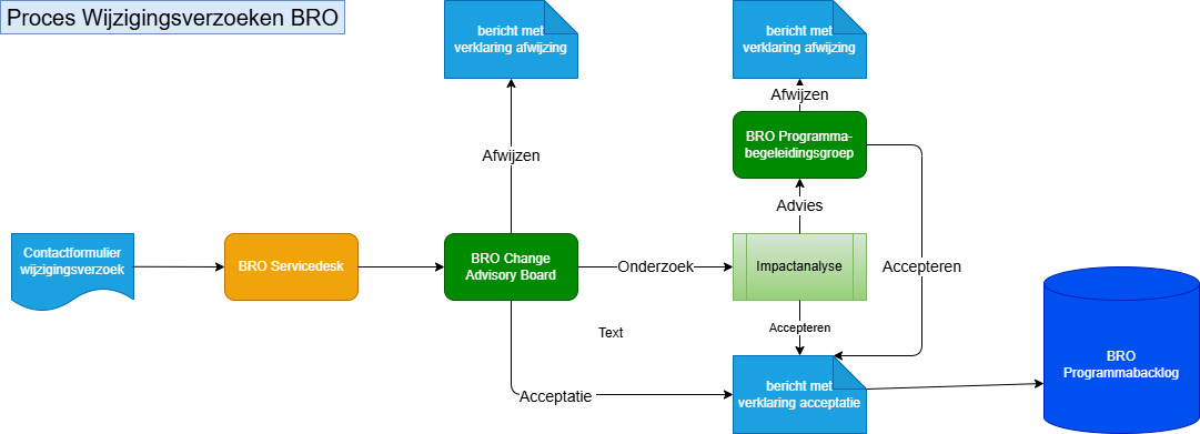 Op de volgende Pagina op basisregistratie.nl hebben wij het BRO wijzigingenproces toegelicht. Hier onder is het proces schematisch weergegeven.