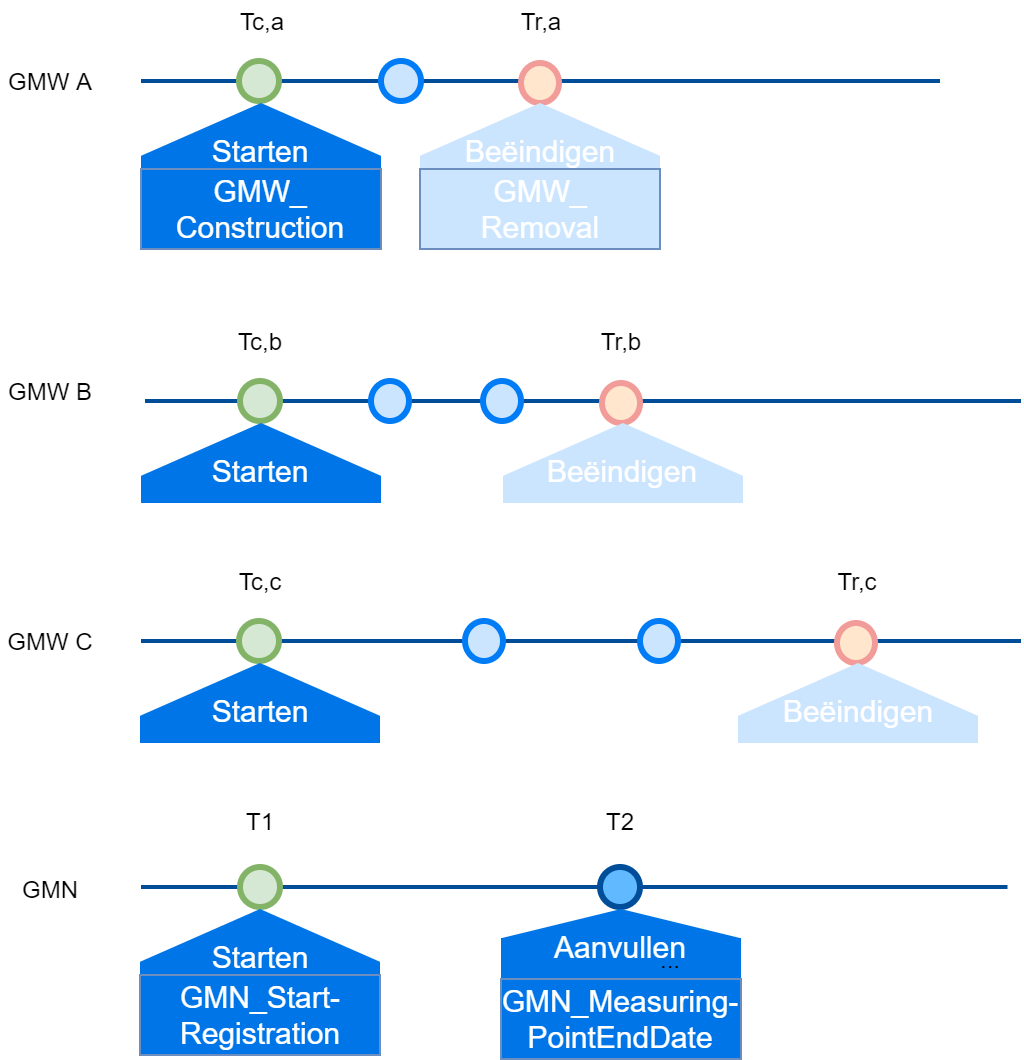 • De startDateMonitoring (begindatum monitoring) van het GMN monitoringnet moet liggen voor de wellRemovalDate (opruimingsdatum put) van de entiteit WellHistory (Putgeschiedenis) van de betreffende grondwatermonitoringput. In de onderstaande figuur met de tijdlijnen van de diverse registratieobjecten vallen de diverse wellRemovalDates (opruimingsdatum put) Tr,a, Tr,b en Tr,c samen met de GMN gebeurtenissen op T3, T4 en T7 respectievelijk. De endDateMonitoring (einddatum monitoring) van een GMN monitoringnet moet liggen na de startDateMonitoring (begindatum monitoring). Voor de startDateMonitoring (begindatum monitoring) moet dus gelden T1 < Tr,a en T1 < Tr,b en T1 < Tr,c.