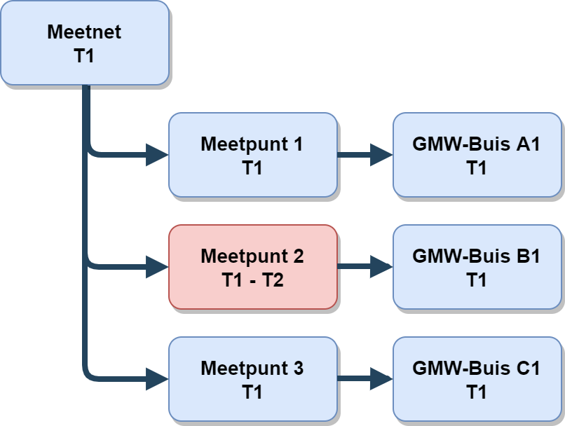 Vanaf T2 vervangt de buisverwijzing A2 de buisverwijzing A1 binnen meetpunt 1. Buisverwijzing A1 was geldig vanaf T1 tot T2 en is nu een historische buisverwijzing. Buisverwijzing A2 is vanaf T2 de actuele buisverwijzing van dit meetpunt.